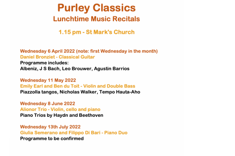 Come along to St. Mark's for lunchtime concerts continuing our programme in association with Purley Classics.